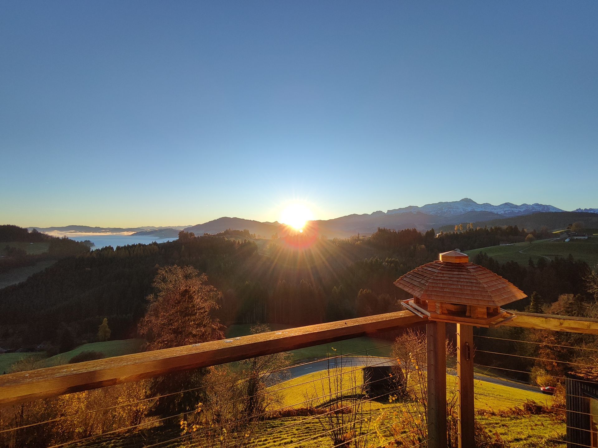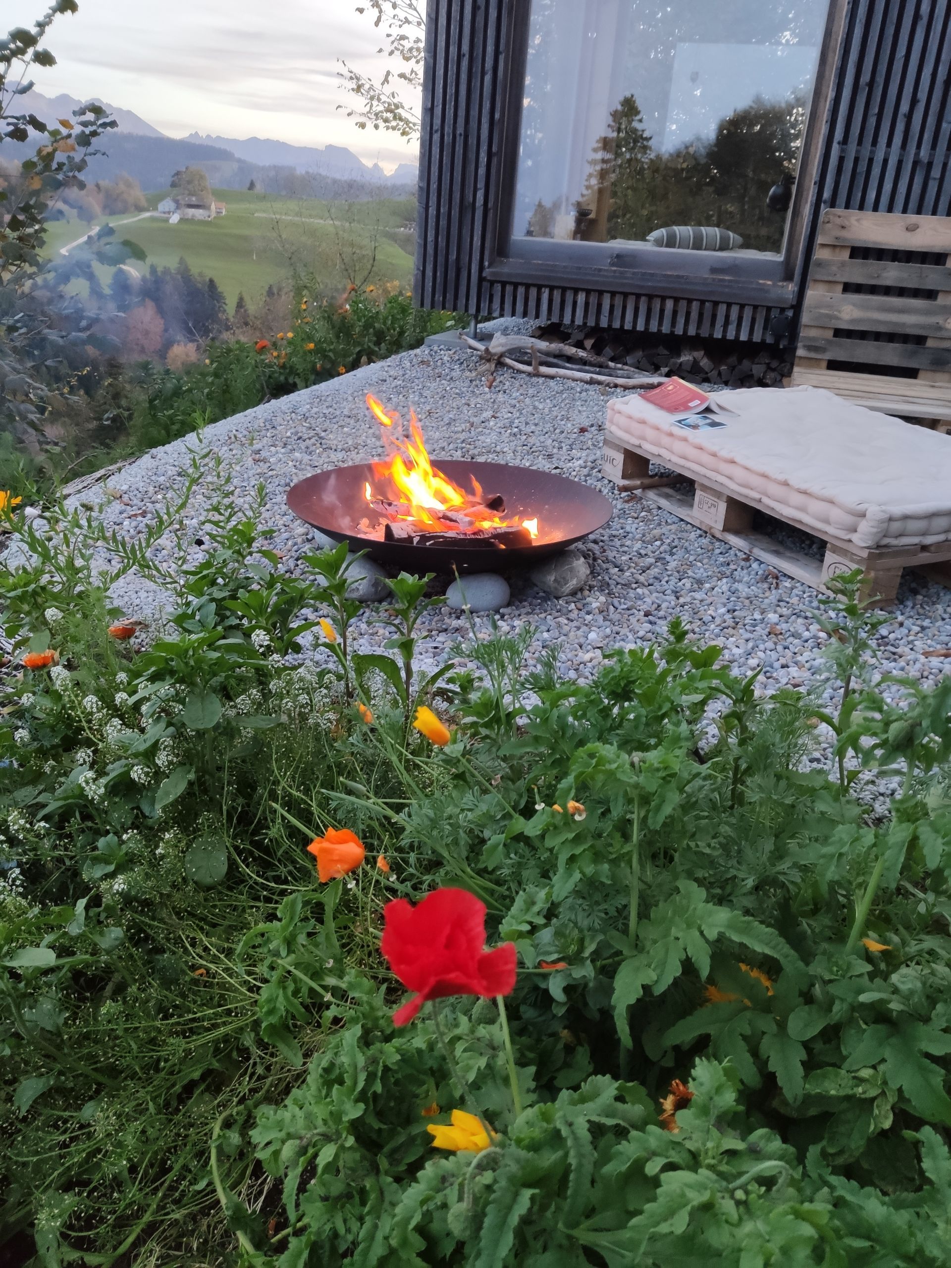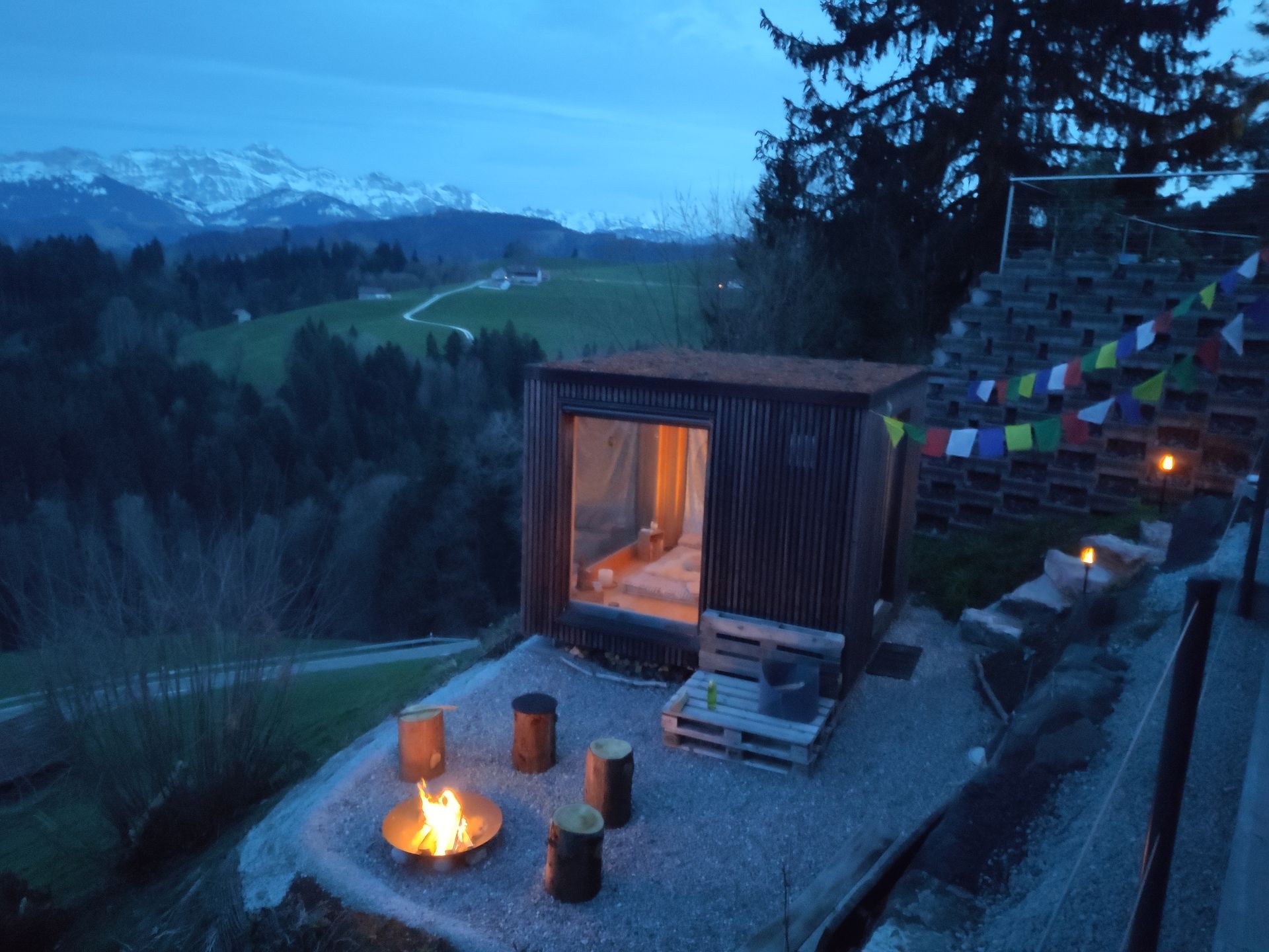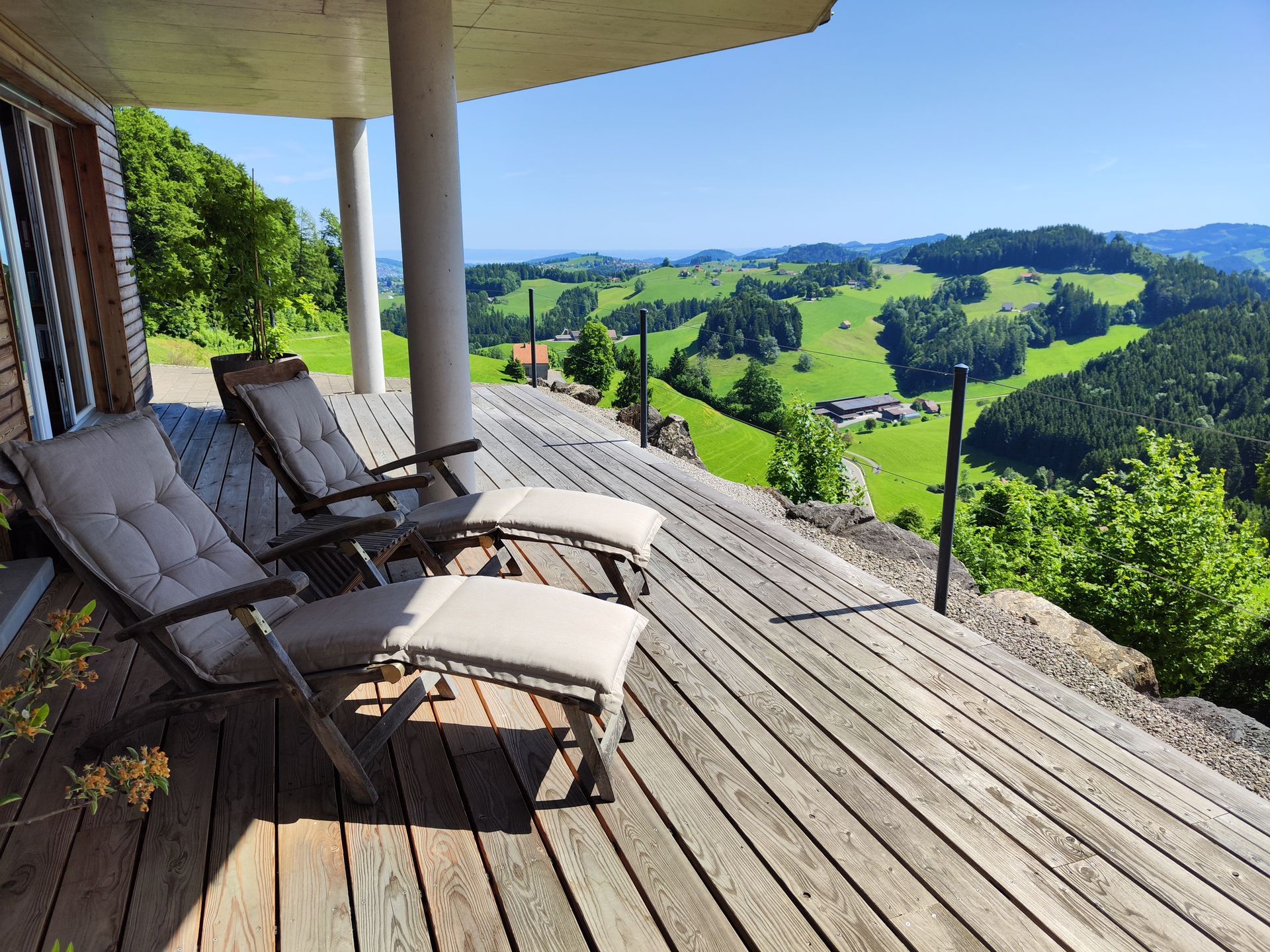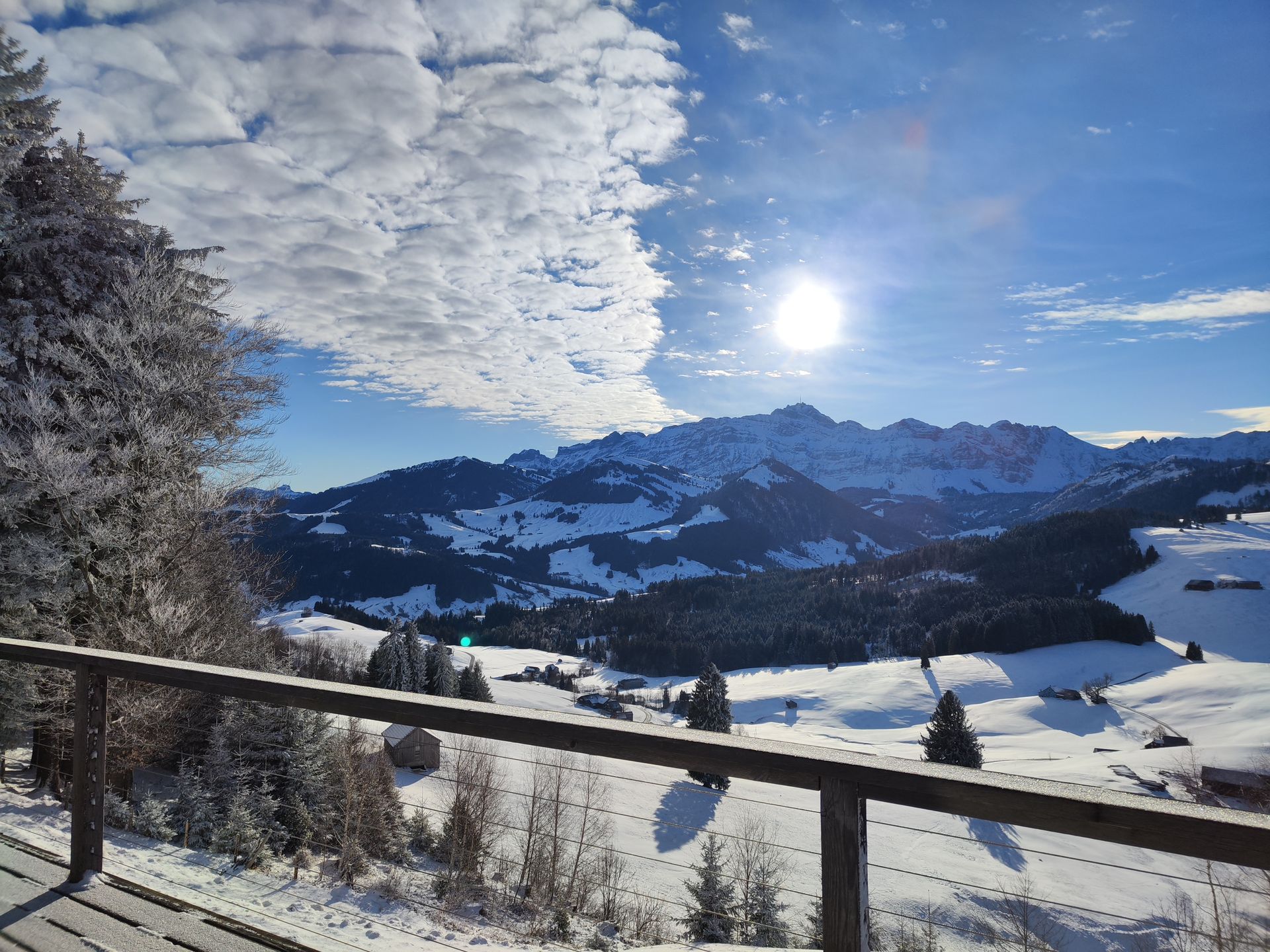 Das Haus il piccolo mondo liegt direkt an der Landwirtschaftszone, am Dorfrand, und ist ein Kraftort! Zusammen mit dem feinen Bimmeln von Kuh- und/oder Ziegenglocken wirkt der Aufenthalt im Freien fast meditativ. Die Aussicht auf den Alpstein und auf den Bodensee ist grandios, und die Lichtverhältnisse je nach Wetter machen jeden Tag einzigartig.