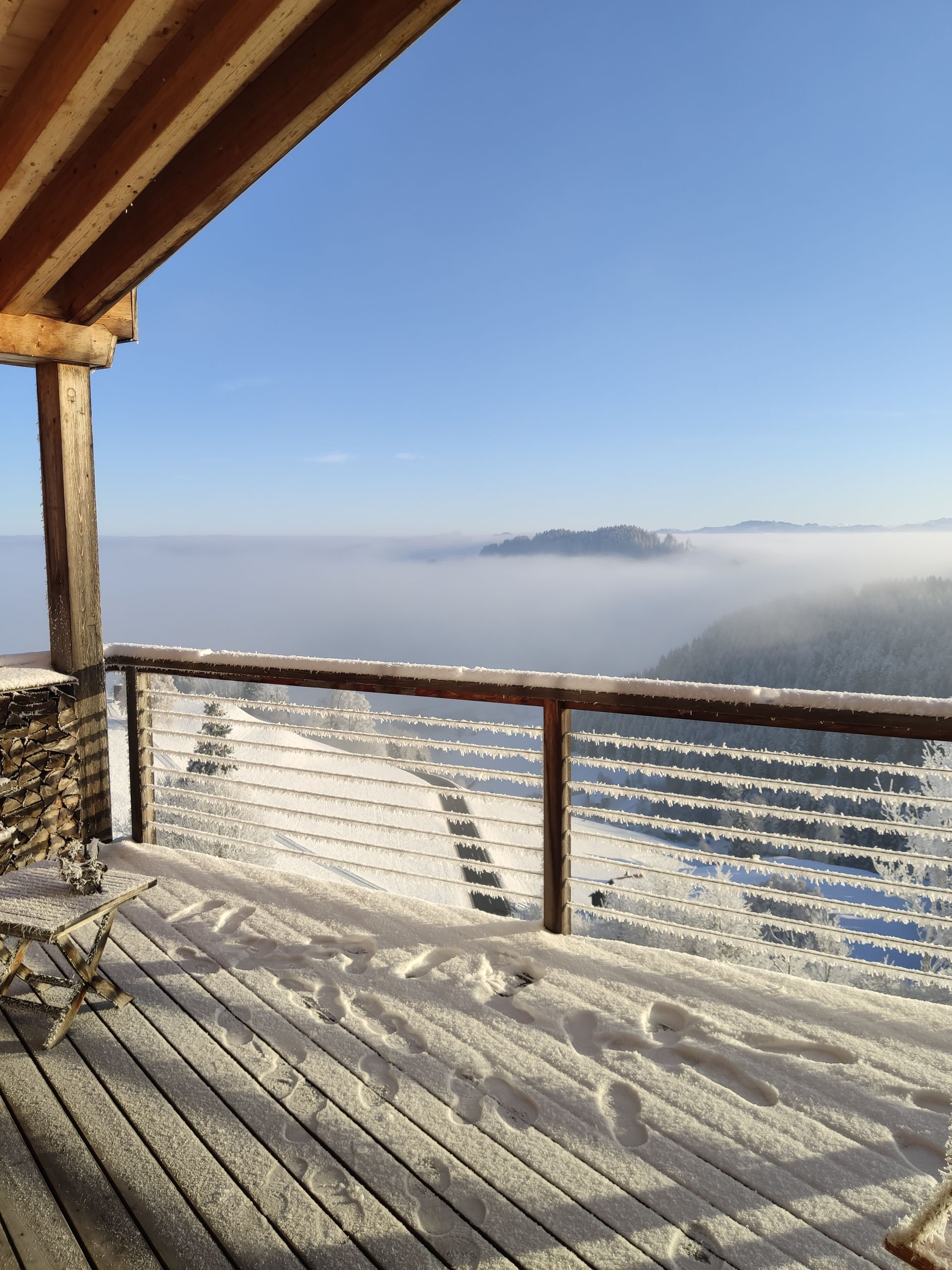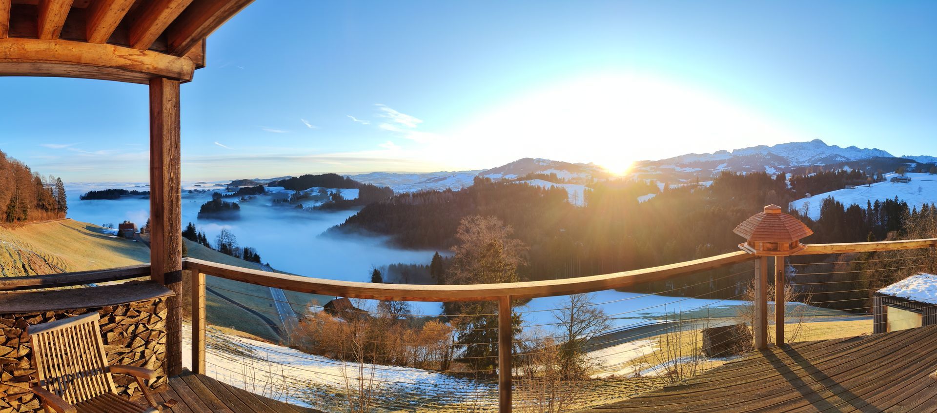 Die Räume des il piccolo mondo sind Licht-durchflutet, und wo viel Licht reinkommt, ist auch eine Weitsicht. Der Ausblick auf den Alpstein und auf den Bodensee ist grandios, und die Lichtverhältnisse je nach Wetter machen jeden Tag einzigartig. Und am Abend erfüllt das Feuer des Ofens den Raum mit Beghaglichkeit und Wärme. Eine Feuerstelle gibt es übrigens auch im Garten.
